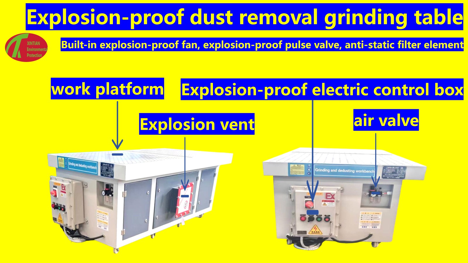 Pri mletju zaženite ventilator. Pod delovanjem ventilatorja se zrak v bližini dovoda zraka na mizi in ob strani navpične plošče vsesa. Zrak, ki vsebuje prah, vstopi v okvir skozi dovod zraka, zrak pa se enakomerno absorbira in zbira s filtrirnim vložkom. Filtrirni vložek filtrira prah v zraku, zrak, prečiščen z zbiranjem prahu, pa se odvaja v ozračje skozi odprtino za zrak na dnu okvirja.