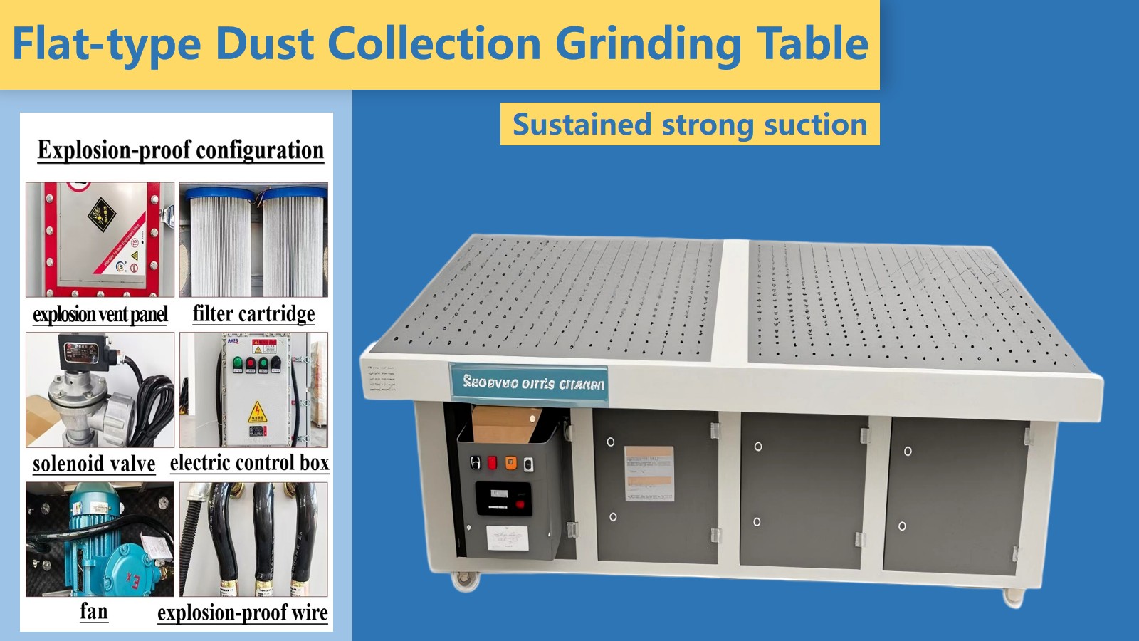 Pri brušenju na ravni brusilni mizi, ki vpija prah, se vklopi ventilator. Pod delovanjem ventilatorja se zrak na mizi in v bližini dovoda zraka na strani navpične plošče vsesa, zrak, ki vsebuje prah, pa vstopi v okvir skozi dovod zraka. Nato se zrak enakomerno adsorbira in zbira na filtrirnem vložku, ki filtrira prah v zraku. Zrak po absorpciji in čiščenju prahu se odvaja v zrak skozi odprtino za zrak na dnu okvirja.